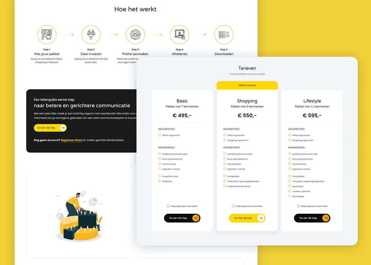 Een applicatie moet niet alleen goed werken, het oog wil ook wat. Door geel te kiezen als basiskleur en te combineren met zwarte wilden we de gebruikerservaring een warme en tevens zakelijk strakke sfeer meegeven. Door vervolgens het proces van pakket selectie tot betaling en rapportage zo optimaal mogelijk in te richten is een platform ontstaan die voor een brede doelgroep gebruikt kan worden zonder tussenkomst van verder support vanuit Cäsar.
